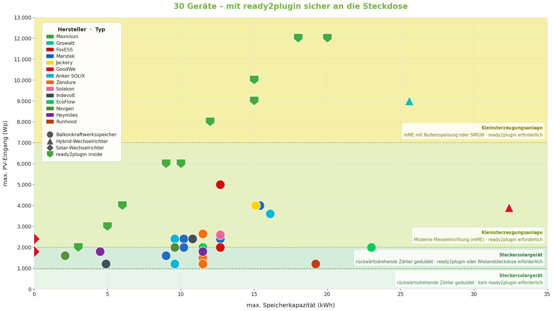 Vom kompakten Balkonkraftwerksspeicher bis zum leistungsstarken Hybrid-Wechselrichter – all diese Geräte können mit dem ready2plugin Stromwächter sicher und legal an die Haushaltssteckdose gebracht werden.